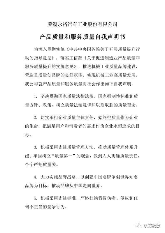 永裕股份發(fā)布產(chǎn)品質(zhì)量和服務(wù)質(zhì)量自我申明